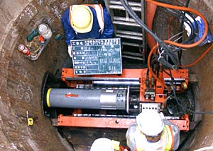 本工法は、塩ビ管の中に鋼製ケーシングを挿入し、その中でスクリューによる排土を行うため、塩ビ管内面を傷つけず、また止水型先導体を使用することで、水頭差4m程度までの滞水層においても、補助工法なしで施工可能です。また、長距離推進にも対応でき、LEDターゲットを使用して、80m程度の長距離推進実績もあります。